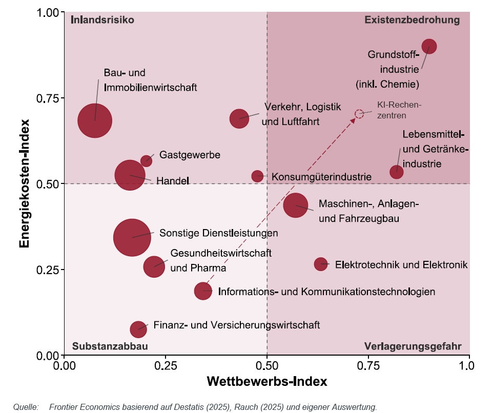 Die Studie zeigt, dass vor allem die Branchen in ihrer Existenz gefährdet sind, in denen eine hohe Betroffenheit von direkten und indirekten Energiekosten auf einen starken internationalen Wettbewerb treffen. Das gilt vor allem für die energieintensive Grundstoff- und Chemieindustrie, aber auch für andere, weniger energieintensive Sektoren wie die Lebensmittel- und Getränkeindustrie, die Konsumgüterindustrie und die mittelständisch geprägten Branchen Maschinenbau und Elektrotechnik.